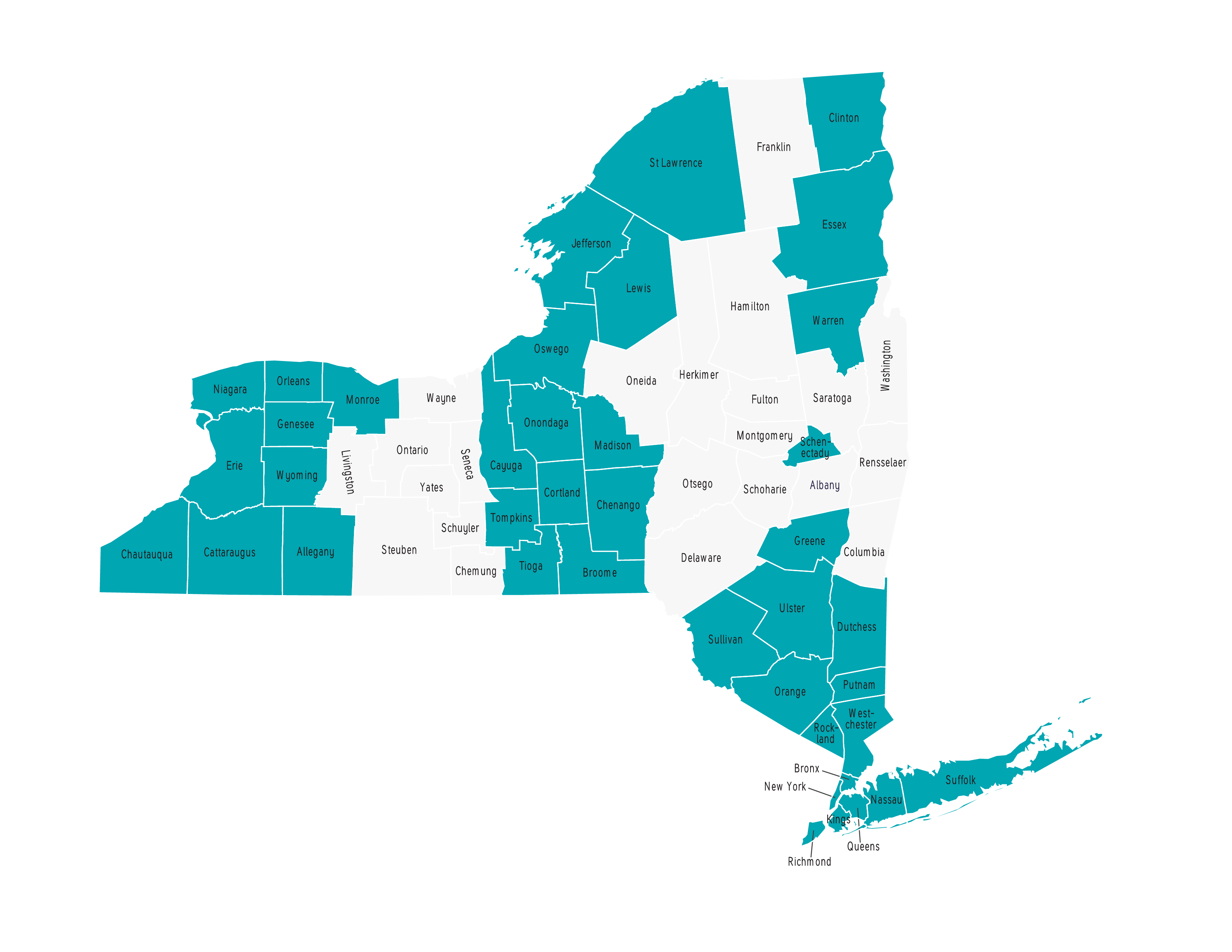 Allegany • Broome • Bronx • Cattaraugus • Cayuga • Chautauqua • Chenango • Clinton • Cortland • Dutchess • Erie • Essex • Genesse • Green • Herkimer • Jefferson • Kings • Lewis • Madison • Monroe • Nassau • New York • Niagara • Onondaga • Orange • Orleans • Oswego • Putnam • Queens • Richmond • Rockland • Schenectady • St. Lawrence • Suffolk • Sullivan • Tioga • Tompkins • Ulster • Warren • Westchester • Wyoming